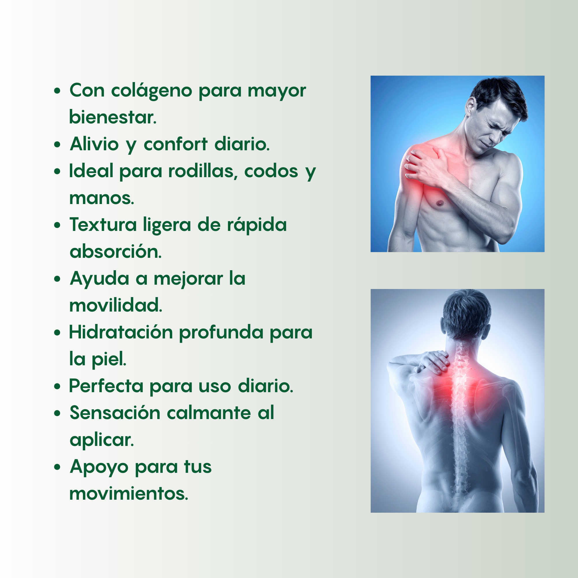 Gracias a su acción antiinflamatoria, reduce la hinchazón, mejora la movilidad y calma el dolor en minutos. Además, es no grasosa, se absorbe rápidamente y deja la piel suave, sin residuos pegajosos.