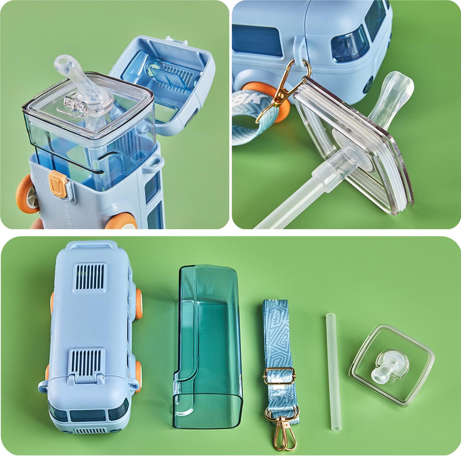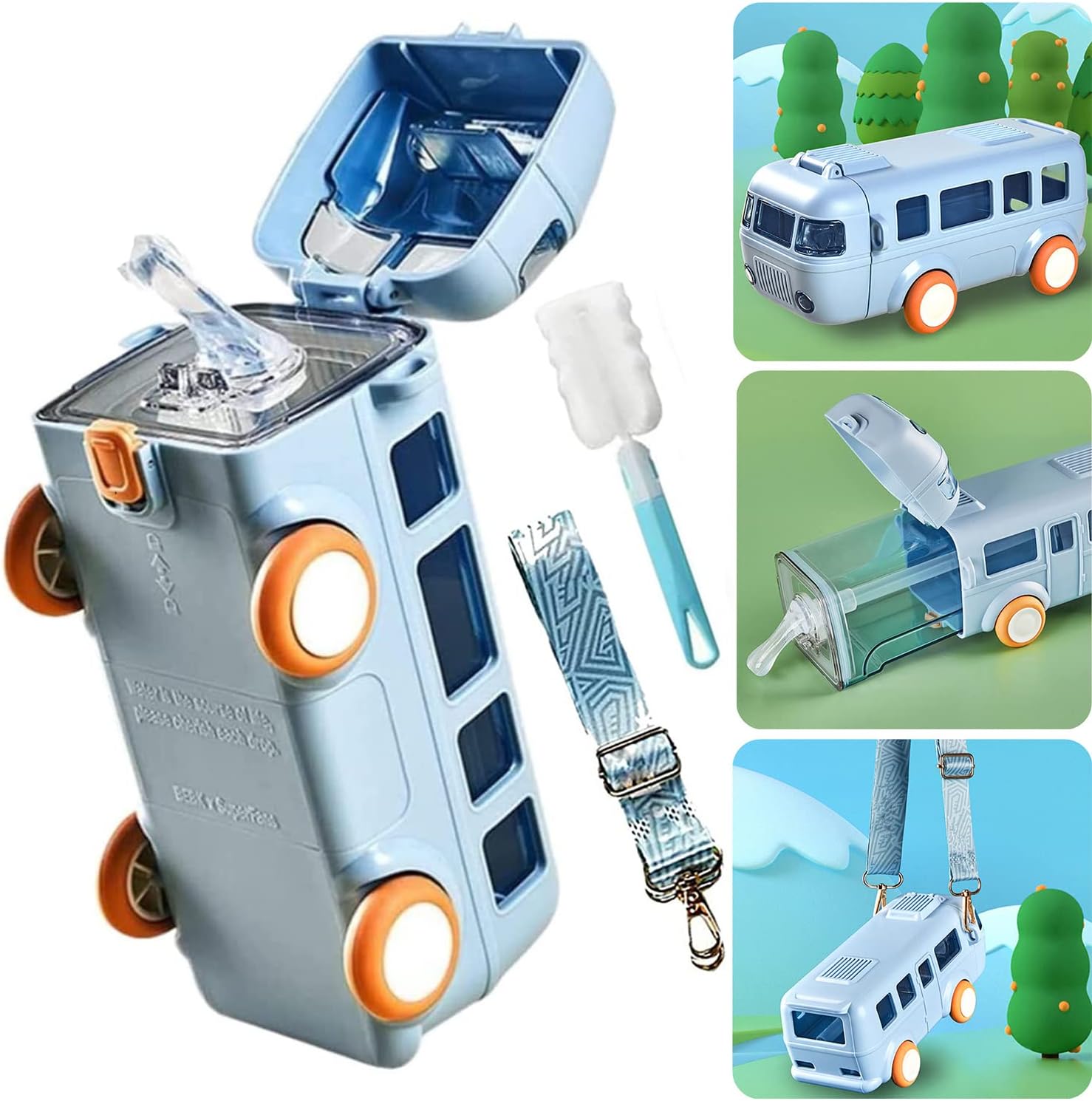 Botella infantil en forma de autobús, 500 ml, con popote, correa ajustable y diseño antifugas 360°. Material seguro y ruedas móviles.